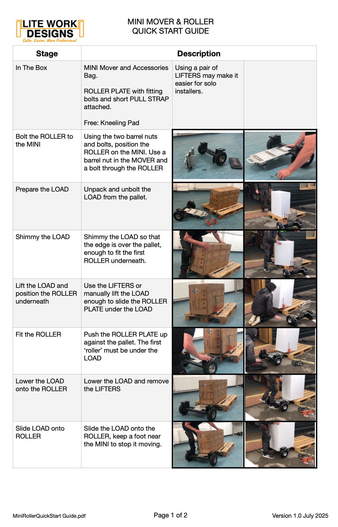 LITE WORK ROLLER Thank you for trying our Lite Work ROLLER and MINI MOVERDuring your trial, please can you take images and/or shoot some video to show us how you are using it. This helps us identify improvements that will help your installers. Training Video Using the ROLLER